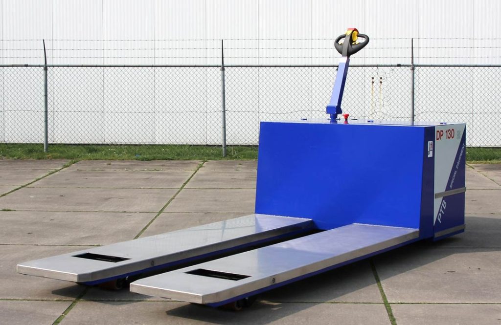 Om grote en zware machinedelen nauwkeurig in een cleanroom te manoeuvreren had ASML behoefte aan een speciale pallettruck. PTB ontwikkelde de DP130; een unieke, compacte pallettruck met een hefvermogen van 13 ton. De machine heeft lange en brede vorken die met een laag roestvrijstaal zijn bekleed.